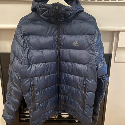 Adidas vinterjacka i storlek XXL för herr, tillverkad i ett yttre lager av tålig nylon och stoppning av polyester. Jackan är gul/grön och har en huva med avtagbar pälsimitation.
