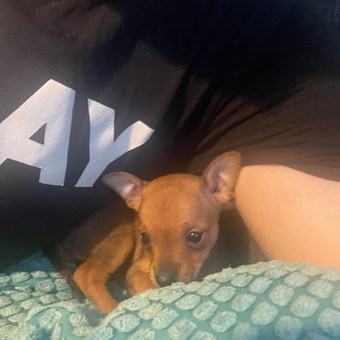 Tik av rasen dvärgpinscher/shih tzu (blandras) söker ett hem som kan matcha hennes energi och livsglädje.