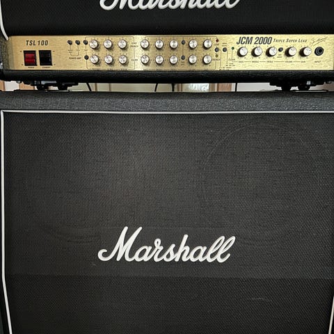 Marshall JVM gitarrförstärkare med svart och guld utförande. Förstärkaren har flera reglage för ljudjustering och en bärhandtag på toppen för enkel transport. Anslutningar och kontroller finns på baksidan för olika ljudinställningar.
