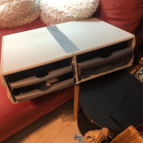 Svart återvinningskärl i plast med metallställning och hjul för enkel förflyttning. Setet består av flera kärl som kan staplas i ställningen för organiserad sortering av avfall eller återvinning. Kärlen är rymliga och lämpliga för användning i hem eller kontor.