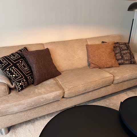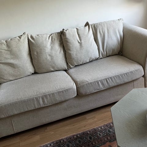 Notera att soffan är stor och tung. Jag kan hjälpa till att få ut soffan till trottoaren, men kommer därefter krävas att åtminstone 2 personer hämtar soffan.