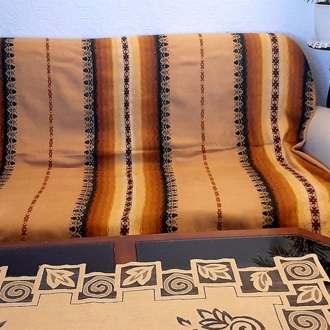Det stämmer, alltså Inga hål eller skador men tyvärr är där små vaga fläckar från slottsägarna enligt bilderna. Mina föräldrar hade fått veta att de ibland blev serverade frukost på sängen. Måtten är 310 x 255 cm. Det inre tyget innanför den inre virkade delen har måttet 165 x 120 cm. Överkastet går att lägga på båda hållen för kanterna är likadana på alla håll. Det har nu varit förvarat i ett djurfritt och rökfritt hem.