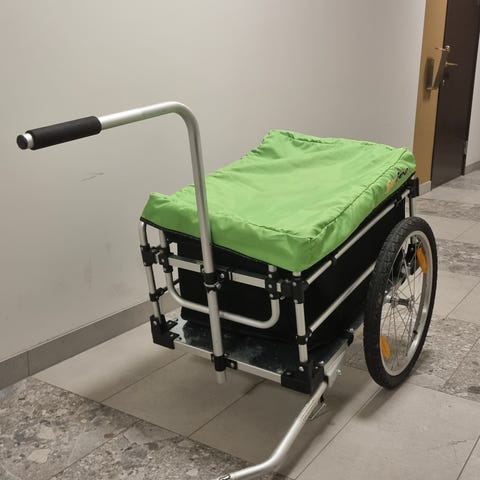 Cykelvagn från Biltema. Fungerar fint i vanliga fall men nu har den punktering på ett däck. Det andra däcket och slangen är också i behov av att bytas. Handbromsen till framhjulet som man kan sätta på för att använda cykelvagnen som en vanlig vagn är även den trasig.