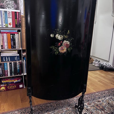Till salu en dekorativ vikskärm rumsavdelare i trä. Skärmen består av 4 sektioner i mörkt trä med snidade detaljer upptill. Panelerna är klädda med dekorativt tyg med blommönster. Passar bra för att dela av rum i bostad, salong eller studio samt som inredningsdetalj.