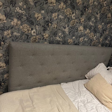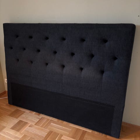 Mio sänggavel i ljus grå med stoppad och knappad design. Passar till 180cm säng