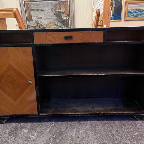 Gedigen skänk i massivt trä som rymmer mycket. Låsbart skåp. Slitet ytskikt, repor och skav.