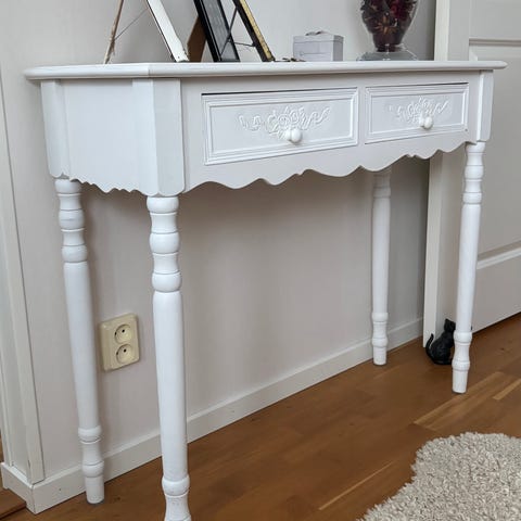 Gammal skänk. Vi har också köpt den på blocket. Målad sedan tidigare. Rymmer mycket. Väldigt tungt! Vi kan inte erbjuda bärhjälp tyvärr. Två hängen till dörrhandtaget är borta