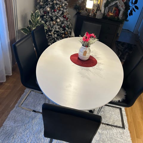 Matbord säljes. 180x90 cm. Finns 6 svarta skinnstolar med visst slitage till om man vill ha.