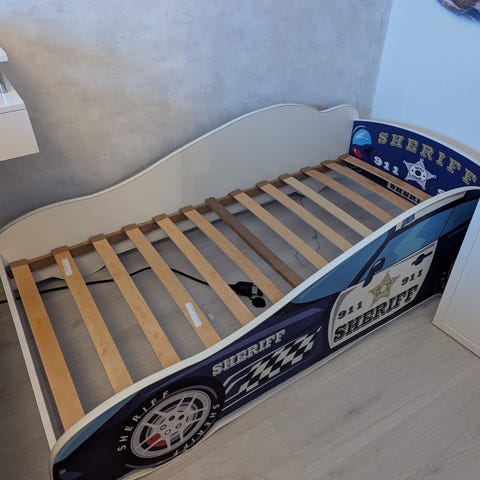 För 200x90cm madrass. Häftig rejäl säng i form av en racingbil. Inbyggt belysning i fronten (9V-batteri). Demonteras isär i fyra delar+ribborna.
