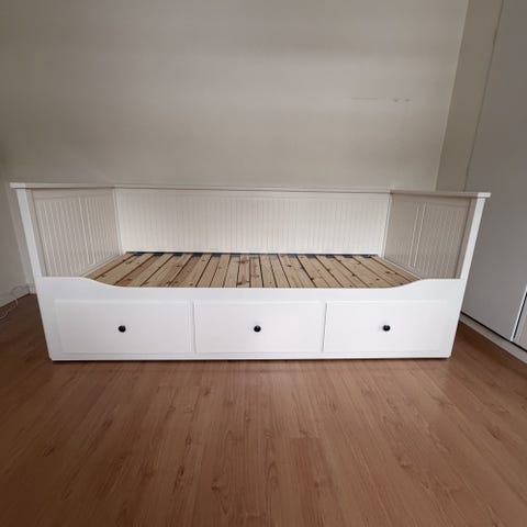 IKEA dagbädd Hemnes med förvaring i grå färg. Sängen har en ram med ribbotten och tre lådor under för extra förvaring. Passar för olika sovrumsmiljöer och kan användas som både soffa och säng.