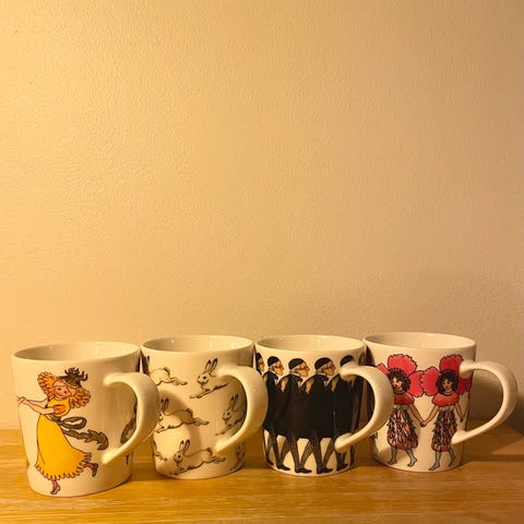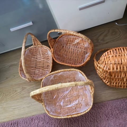 Flätade pilkorgar med rutigt tygfoder. Bra skick. Pris: ca 300–500 kr/st.