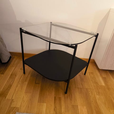 Ett sexkantigt vitt soffbord / sidobord i trä med fasettslipad glasskiva och ett undre hyllplan.