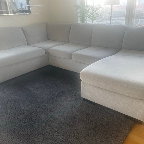 Soffan är mycket skön att sitta, slappa, ligga och sova i. Den fungerar felfritt och har stått i ett rök- och djurfritt hem, men har ett litet märke på en av kuddarna och ett på sidan av soffan.