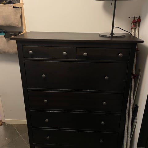 IKEA Hemnes byrå i vit färg med flera lådor för förvaring. Möbeln är tillverkad i trä och har svarta knoppar som handtag. Passar för förvaring i olika rum.