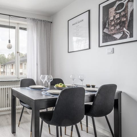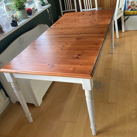 Gråmålat matbord med stålben säljes pga. flytt. Bordsskivan är 160 + 48 (iläggsskiva) lång. Har en skada i träet, se bild. Finns att hämta i Saltsjöbaden.