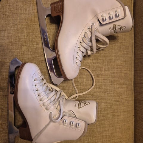 Jackson Mystique konståkningsskridskor i storlek 39 (1490/7), se bilder. Passar bra en liten bredare fot. Skridskorna är vita med läderliknande material och har en traditionell snörning.