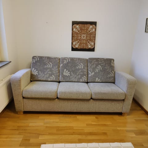 Säljer min soffgrupp när jag behövde en större soffa för att få plats med hela familjen, tvåsitsen är lagad med annan skruv (se bild)