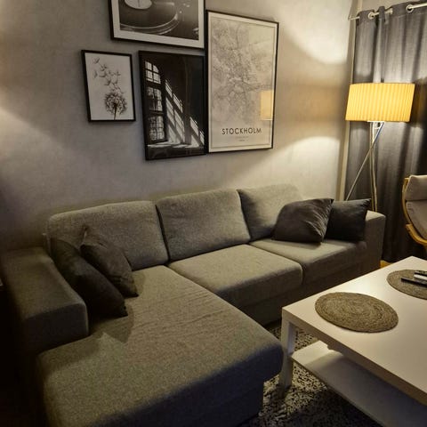 Soffa med divan och två sittpuffar