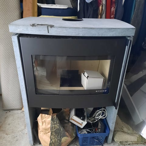 Contura 510 Täljstenskamin i svart metall med grå täljsten. Glaslucka. Sparsamt använd.