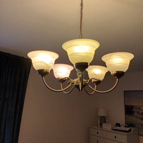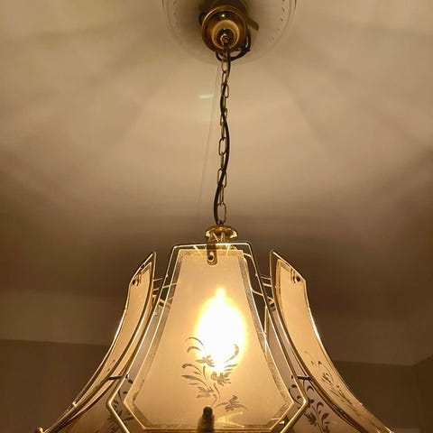 Taklampa med rund glasglob i vitt och metallfäste (justerbart) i mässing. Passar för allmän belysning i inomhusmiljöer, suttit i vår hall i sekelskifte men passar tyvärr inte i vårt nya hus.