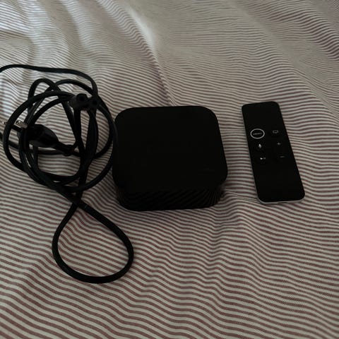 Apple TV digitalbox med fjärrkontroll och strömkabel. Enheten är svart och används för att strömma media till TV-apparater. 3:e generation