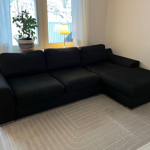 Grå soffa med schäslong från Folkhemmet. Ryggkuddarna är vändbara.