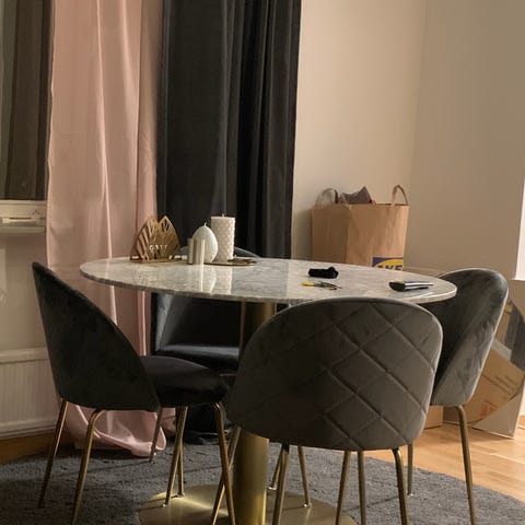 Matgrupp Tiffany från Mio. Runt matbord med marmorskiva och guldfot. Riktigt fint marmormönster. Stolar i beige tyg Kiwi från Mio med guldben.