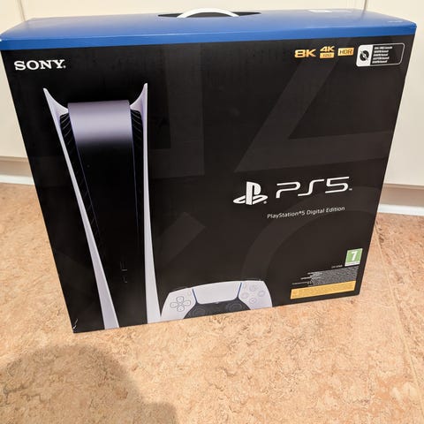 Sony Playstation 5 spelkonsol i vit färg. Konsolen levereras med originalförpackning och tillbehör inklusive strömkabel och handkontroll.