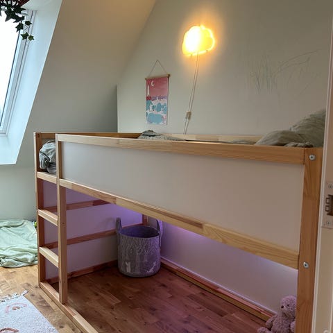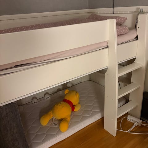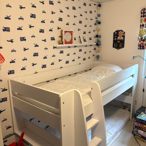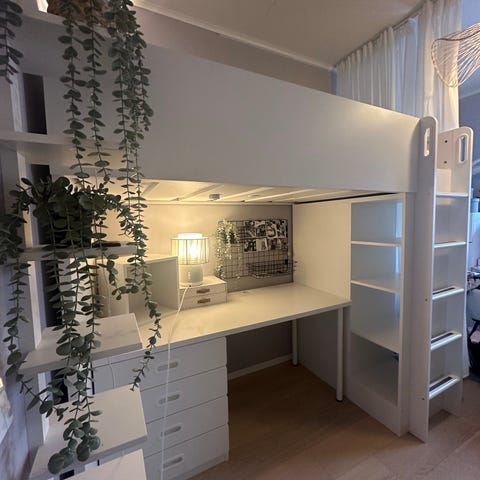IKEA Loftsäng för barn med integrerad förvaringshylla, garderob och skrivbordsyta under sängen. Sängen har en vit finish och är utformad för att spara utrymme i barnrum. Madrassen ingår. Passar för barn och ungdomar.