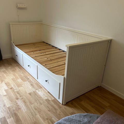 Utdragbar säng från IKEA men två stora praktiska lådor för förvaring. I gott skick men med några mindre skav, se bilder. Sängen har led-lights på kanten som fås på köpet.
