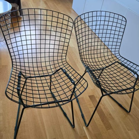 Två stolar i snygg design, toppskick förutom att det fattas två skruvar på den ena, se sista bilden. Sitthöjd ca 40-41 cm, 509 kr för båda
