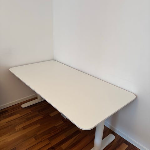 Höj- och sänkbart skrivbord med vit skiva och svart stativ