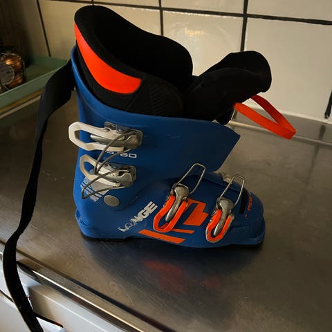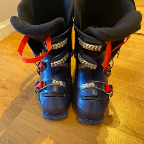 Lange skidpjäxor i blå färg med orange spännen. Storlek 17/18,5 Använda med ok skick.