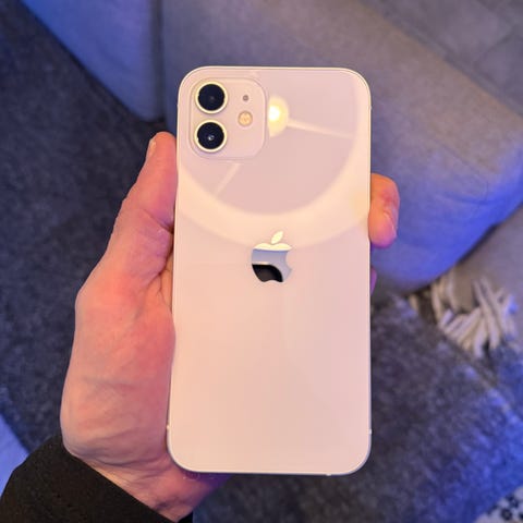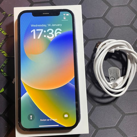 Apple iPhone 12 mobiltelefon med 64 GB lagringskapacitet i blå färg. Funkar helt som vanligt men är rätt så använd med sprickor. Kan användas till vad som helst. Köptes 2021.
