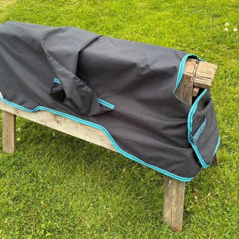 Ett helt nytt oanvänt föltäcke (utegångs) med taggen kvar, som mitt föl hann växa ur innan det blev läge att använda det. Märke Amigo Horseware med kraftiga kardborrefästen vid bogen samt magplatta/maggjord. Svansrem. Storleken syns på bild 3. Det kan säkert även passa till shetland eller annan mindre ponny. Finns i Kalvsvik utanför Växjö, men kan skickas efter överenskommelse. (Nypris 799:-, mitt pris 450 :-)