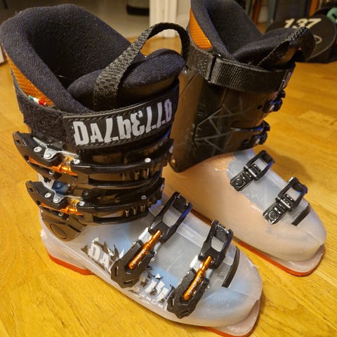 Pjäxa Dalbello Viper 50 jr, grön/gula. Storlek 249/205. Innermått 205 cm är cirka storlek 32.