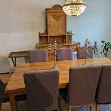 Masiv ekmöbler Bord med 6 stolar skin vitrinskåp samt skänk säljes tillsammans.