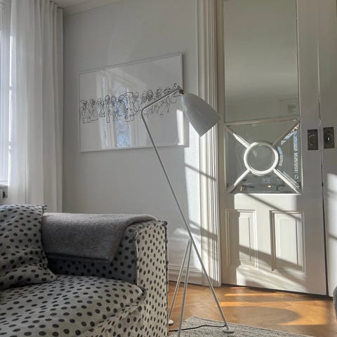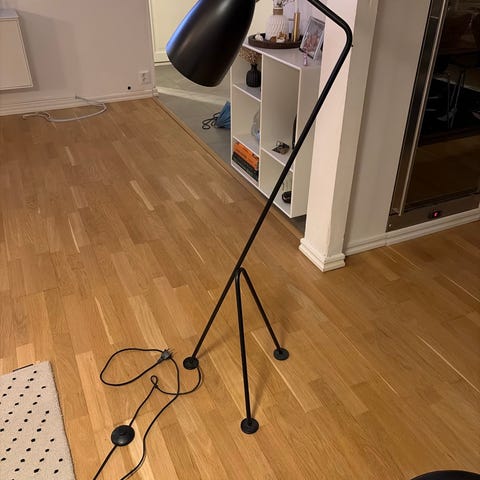 ”Gräshoppa golvlampa från GUBI är en tidlös klassiker formgiven av Greta Grossman 1947. Med sitt lutande stativ i stålrör och en vridbar skärm i aluminium ger lampan riktat, behagligt ljus där du behöver det mest. Den pulverlackerade ytan och den tydliga siluetten gör den både robust och elegant i hemmet — perfekt bredvid läsfåtöljen eller som dekorativ ljuskälla i vardagsrummet. En praktisk och vacker detalj som ger rummet karaktär och funktion.”