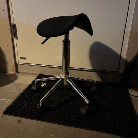 Sadelstol i svart tyg, höj och sänkbar 45-65 cm. Fint skick, sparsamt använd.