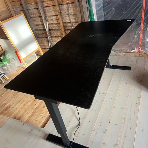 Säljer ett vitt skrivbord som är elektriskt höj och sänkbart. Vit skiva med svarta sidor, snyggt och praktiskt.