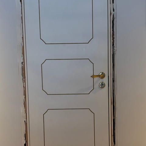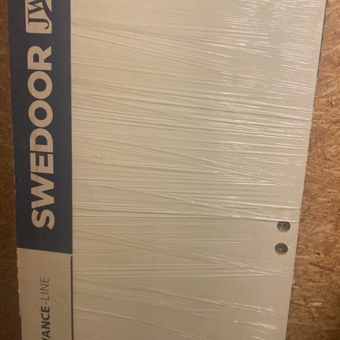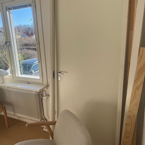 Innerdörr i trä, vitmålad, med måtten 70x200 cm. Dörren har hål för handtag och är avsedd för inomhusbruk. Allt ska bort, kom