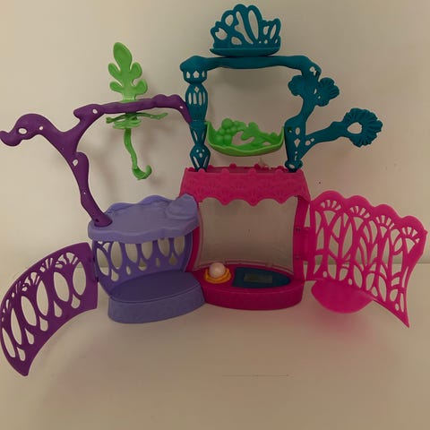 My Little Pony lekset som inkluderar ett slott och en trädkoja i plastmaterial. Setet innehåller flera figurer och tillbehör för lek och samling.