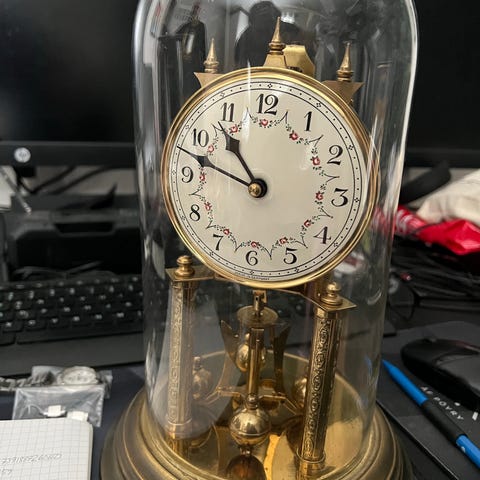 Kundo bordsklocka med glasburk och mässingsdetaljer. Klockan är mekanisk med synliga rörelser och har en rund urtavla med siffror. Basen är oval och i mässingsfärg. Glasburken skyddar urverket och gör klockans mekanik synlig.