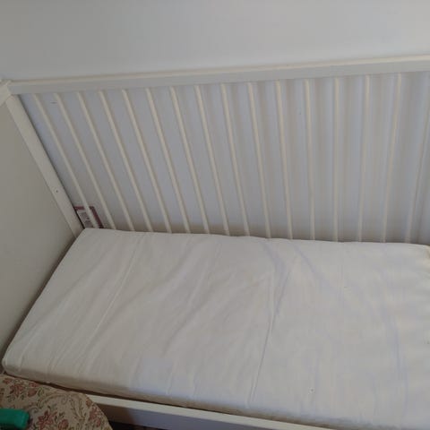 Vit spjälsäng med hjul för enkel förflyttning. Tillverkad i trä med spjälor runtom. Sängen har en plattform för madrass och är anpassad för barns användning.