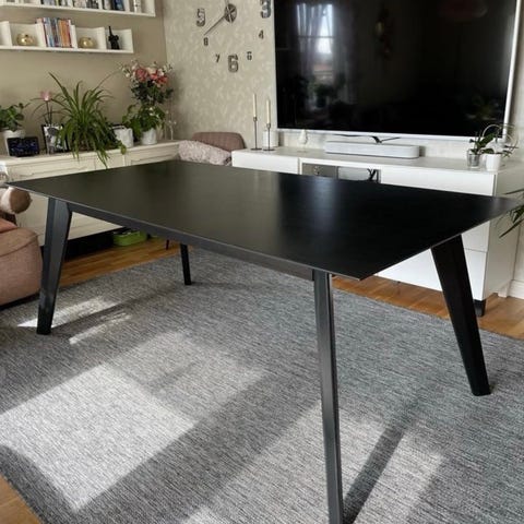 Bord i trä med måtten 180x100 cm. Bordsskiva i trä och ben i metall. Färg på bordsskiva i trä och ben i metallfärg. Passar för matsal eller arbetsrum.