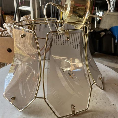 Taklampa i rökfärgad mässing, 47 cm i diameter och ca 35 cm hög. 300kr