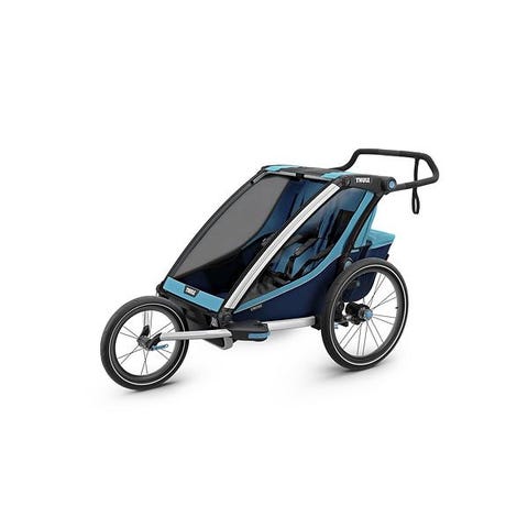 Thule Chariot sport 2 barnvagn i svart färg. Designad för att transportera barn med säkerhetsbälten och skyddande kåpa. Utrustad med stora hjul för stabilitet och enkel manövrering. Passar för olika utomhusaktiviteter och terränger.
