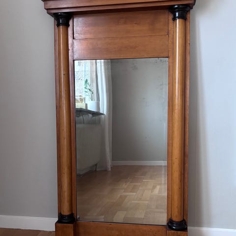 Elegant, smidig spegel. Eriksmålaglas, maskinglas kval. AA. Storlek 62x40, föste/hänge bak. Glaset lite fasat mot fin tunn ram, se bilder. Pryder sin plats i hemmet.