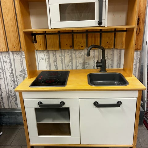 Lekkök i grön färg med spis, vask och ugn samt dörr med förvaringsutrymme. Kökets yta har fyra spisplattor och en vask med kran. Köket har krokar för upphängning av tillbehör. Ingår lite lektillbehör som gryta, stekpanna, salt och pepparkvarn m.m. Finns något enstaka märke med är i bra skick och har använts hyfsat lite. Nypris 1399, mitt pris 700.