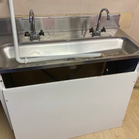 Diskho i rostfritt stål med två hoar. Utrustad med avloppsrör och kopplingar. Passar för köksinstallation.